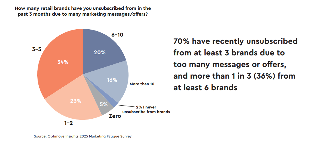 - Message Overload Leads to Unsubscribes: Seventy percent (70%) of consumers unsubscribed from at least three brands in the past three months due to overwhelming message volume, with 37% identifying email as the most annoying channel for excessive communication. See image 1